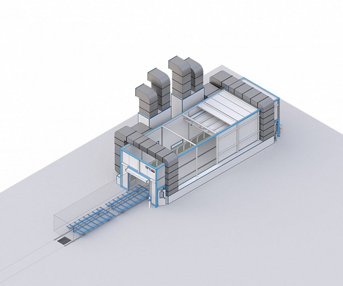 Окрасочно-сушильная камера представляет собой обитаемую установку периодического действия, предназначенную для проведения окраски и последующей сушки изделий в контролируемых условиях. Камера выполнена в климатическом исполнении УХЛ4 и обеспечивает поддержание температуры окраски на уровне 20°C ±2°C, а температуры сушки — 60°C ±2°C.